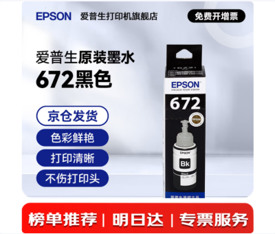 首页 / 办公耗材 / 硒鼓、粉盒 / 墨水盒 / 爱普生(EPSON)原装672墨水L130 L301 L310 L313 L360 L363 L380 L383 打印机 672BK【黑色】