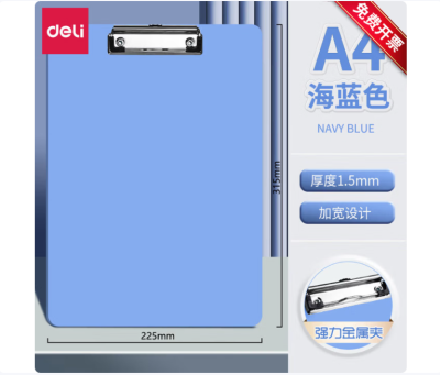 首页 / 办公耗材 / 文教用品 / 文具 / 得力(deli)A4书写板夹多功能文件板夹金属强力夹会议夹写字垫板诗朗诵垫夹板 【蓝色】磨砂1.5mm+挂钩 5310AS