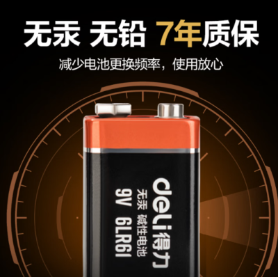 得力(deli)9V碱性电池1粒装 9v方块电池适用于遥控玩具/烟雾报警器/无线麦克风/万用表/话筒等【包邮】 LH900
