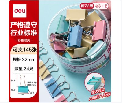 首页 / 办公耗材 / 文教用品 / 文具 / 得力(deli)24只32mm彩色长尾夹票夹 3#中号金属燕尾夹票据文件夹办公 24只/筒 8553ES