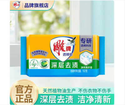 首页 / 办公耗材 / 清洁用品 / 肥(香)和合成洗涤剂 / 雕牌 102g 洗衣皂 肥皂 透明皂 深层去渍 洁净衣物去污去渍