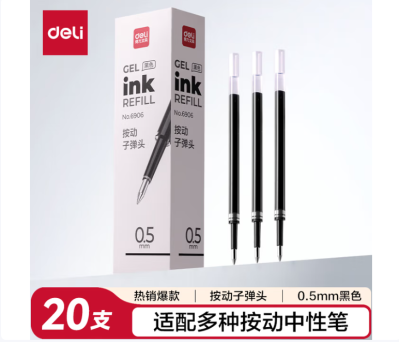 得力(deli)0.5按动中性笔芯 学生办公水笔签字笔替芯 S01/S08/1008/K35适用同G-5 子弹头20支/盒黑色 P06906