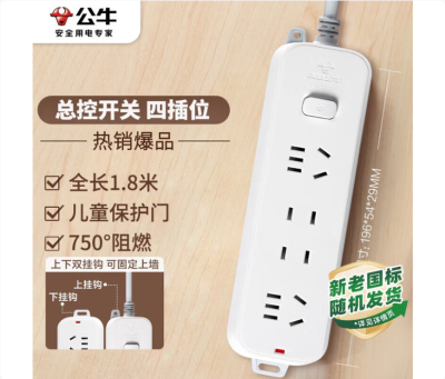 公牛(BULL)插座/插线板/插排/排插/接线板/宿舍家用桌面拖线板 3C认证 4位总控开关全长1.8米 GN-B3220