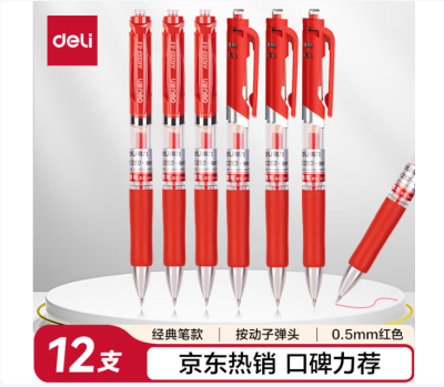 得力(deli)S01按动中性笔签字笔 0.5mm子弹头经典办公按动笔水笔 红色 12支/盒