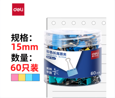 首页 / 办公耗材 / 文教用品 / 文具 / 得力(deli)60只15mm彩色长尾夹票夹 6#小号金属燕尾夹票据文件夹子 办公用品 60只/筒 TP206