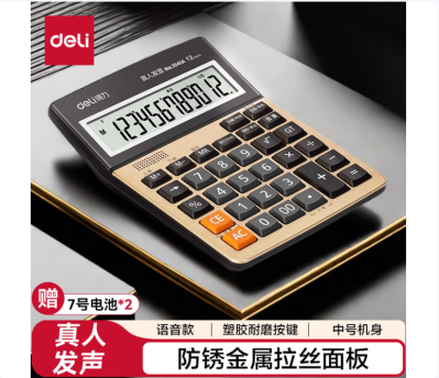 首页 / 办公自动化设备 / 会计机械 / 计算器 / 得力(deli)12位大屏幕语音计算器 闹钟日历功能语音计算机 学生/办公口算 办公用品 金色1541A